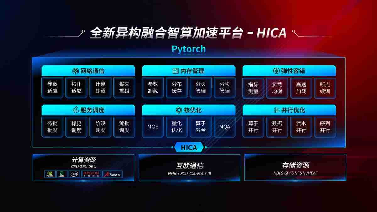 通过自研的服务层、、中间适配层、、、以及调度编排算法,,采用数据并行、、模型并行等多种并行方式,,把并行计算任务进行有效的分解,,,使其分别由相应的软件栈和算力资源来承接。。。。当GPU资源变化,,HICA可以实时动态调度计算子任务并调整模型拓扑和架构,,以充分聚合各种算力资源。。