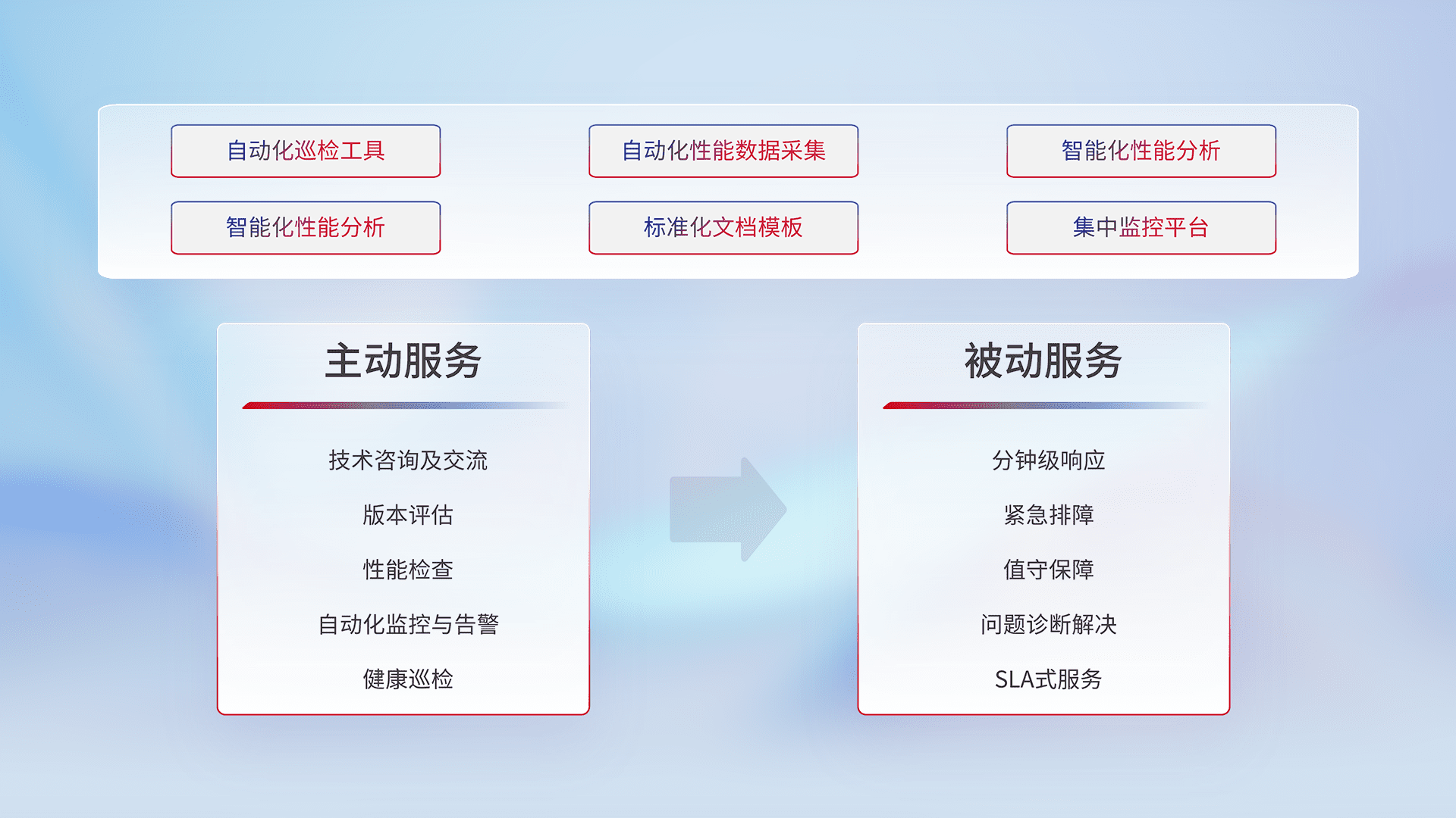 智能化工具和标准化文档,,,,保障服务质量,,提供主动服务(包含技术咨询、、、、版本评估、、、、性能检查、、、自动化监控与告警、、、、健康巡检)和被动服务包含(分钟级响应、、、紧急排障、、、值守保障、、问题诊断解决、、、SLA服务)。。